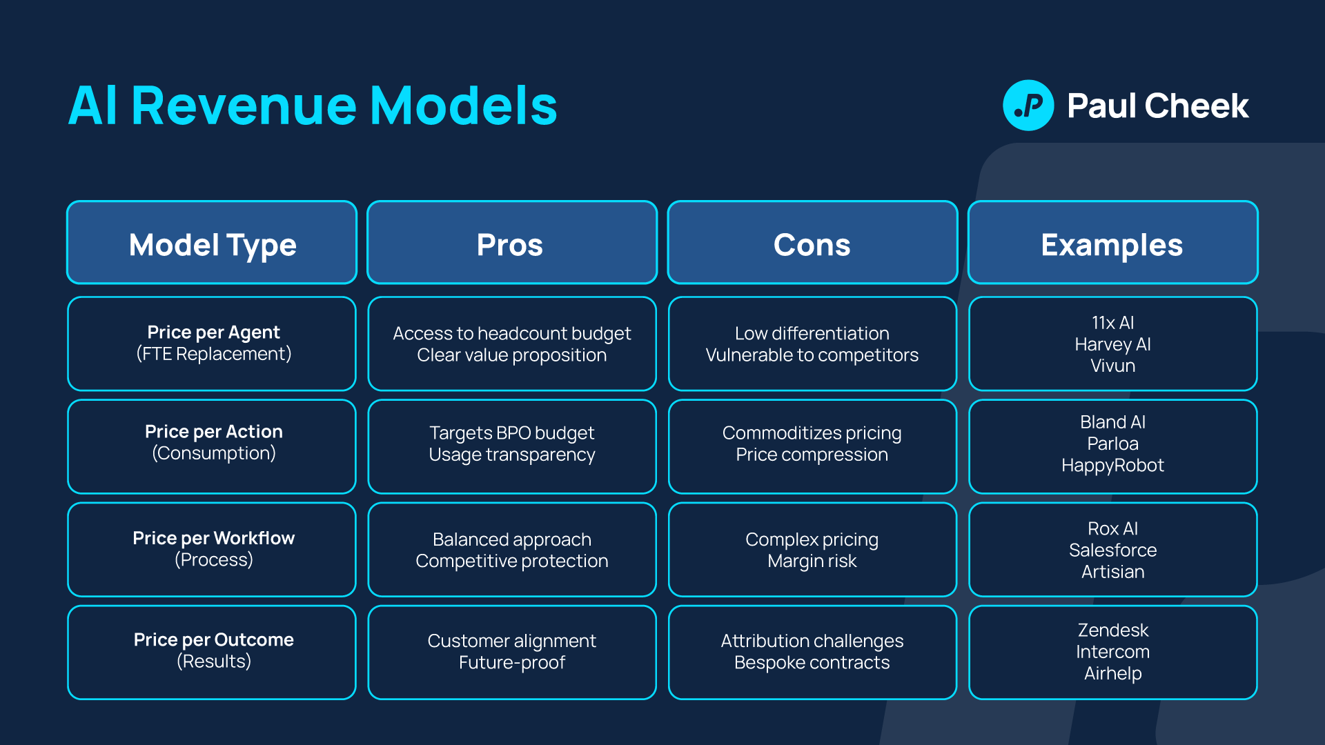 The evolution of these revenue models reflects the broader maturation of the AI industry and the increasing sophistication of both vendors and customers in understanding AI value creation. While each model has its place in the current market, the trend toward outcome-based pricing suggests that the most successful AI companies will be those that can demonstrate clear, measurable value creation for their customers while building sustainable competitive advantages that resist commoditization.